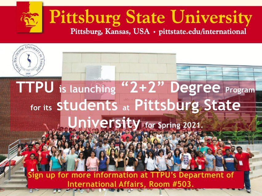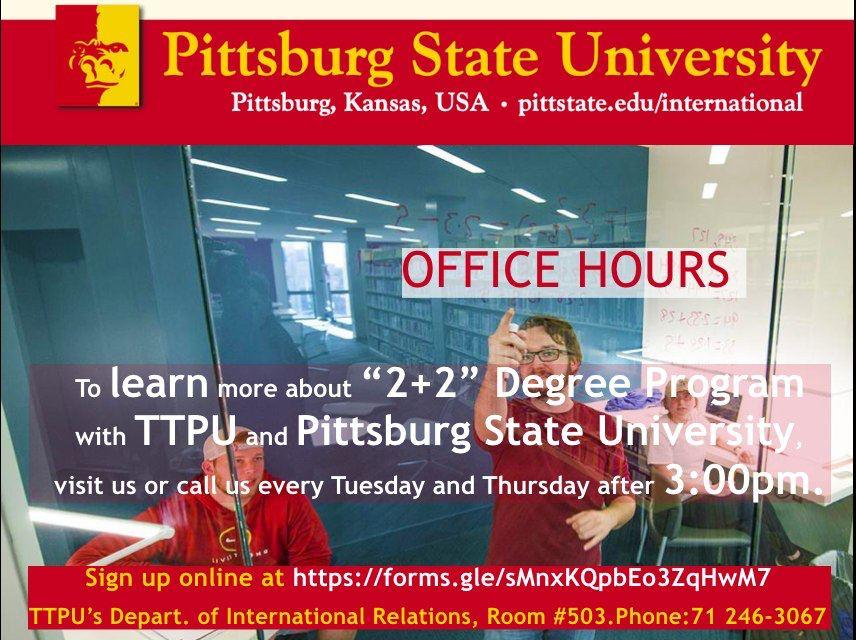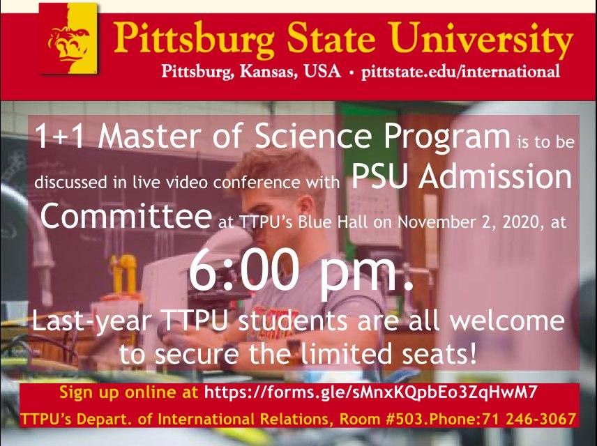 You all are welcome to the the life video conference with Pittsburg State University (USA) Admission Committee that will be held on the Blue Hall of Turin Polytechnic University in Tashkent on November 2,2020 at 6:30 PM.